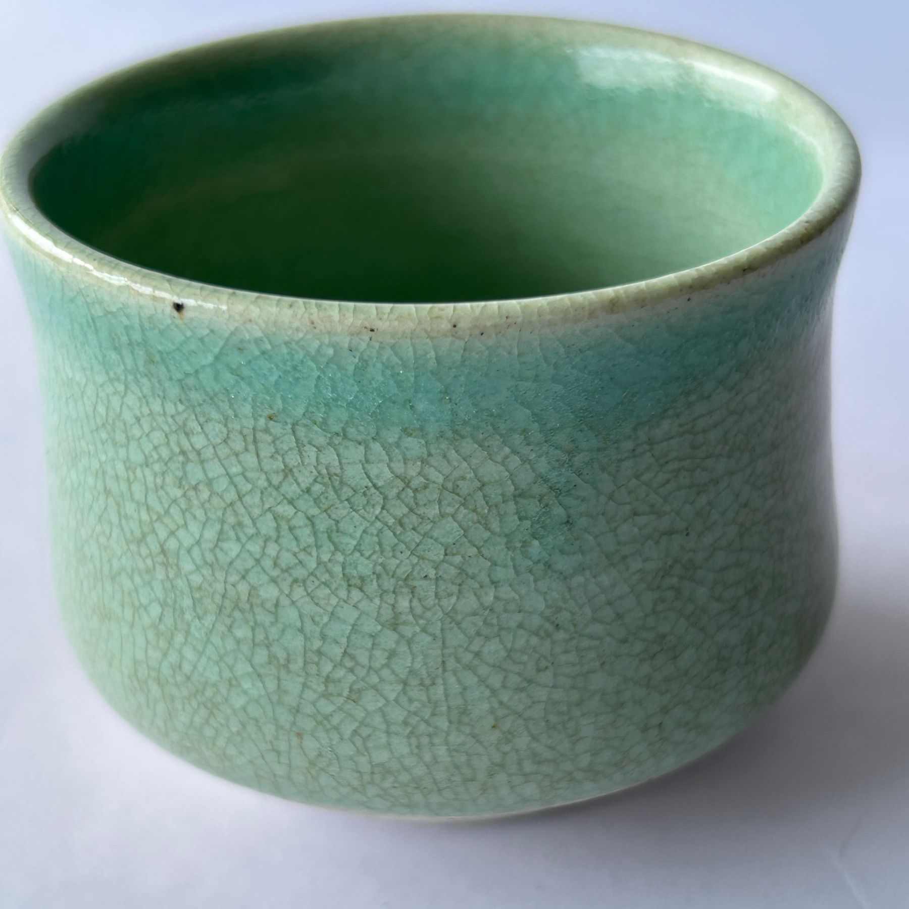 Por que se encaixa: Embora não seja estritamente um celadon, a coloração esverdeada do copo evoca a beleza e a tradição dos esmaltes celadon, muito valorizados na cerâmica oriental. "Kokoro" (coração/espírito) adiciona uma camada de profundidade, sugerindo que o espírito da cerâmica tradicional e o afeto do artesão estão presentes na peça.